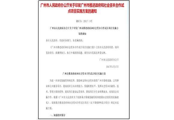 項目亮點 在課題研究成果的基礎上,廣州市政府2017年出臺了《廣州市推進政府和社會資本合作試點項目實施方案》。